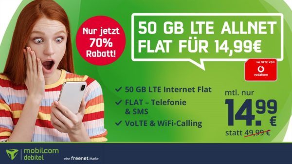 Ist denn schon wieder Black Week? Bei diesem Tarif könnte man das denken 😉 Bei mobilcom-debitel bekommt ihr die 50 GB LTE + Alles-Flat im Vodafone-Netz für 14,99€/Monat.
