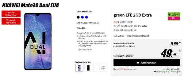 *TOP* HUAWEI Mate20 inkl. 2GB LTE + Telefon-Flat + Hotspot-Flat im Telekom-Netz für 11,99€/Monat