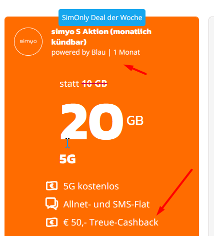 - 20GB mit 50Mbit/s im o2 Netz (monatlich kündbare Variante auswählen!)