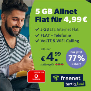 Krass! Da haut freenet wieder nen richtig krassen SimOnly-Tarif raus! Jetzt bekommt ihr eine 5 GB LTE AllnetFlat (Vodafone) für 4,99€/Monat ohne AG!