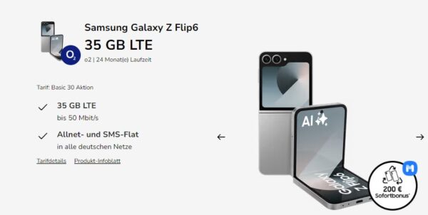 *KRASS EFF. 191€ ERSPARNIS* Dank 200€ Bonus! Samsung Galaxy Z Flip6 (256GB) + 35GB LTE + Allnet-Flat im o2-Netz für 19,99€/Monat