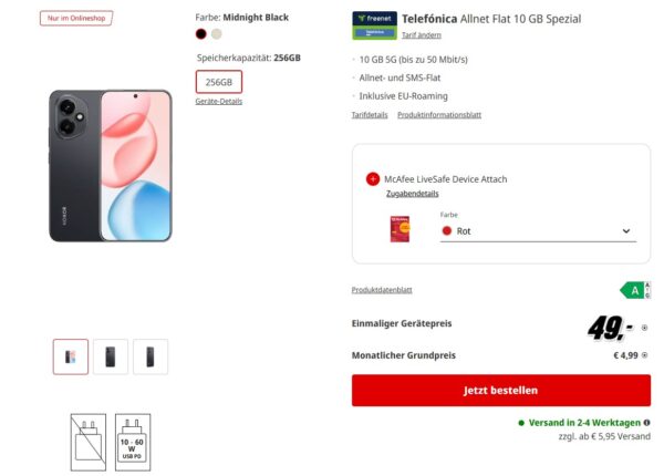 Richtig krasser Budget-Deal von MediaMarkt, dort bekommt ihr das Honor 400 256GB +10GB 5G + Alles-Flat im o2-Netz für NUR 4,99€/Monat + Zuzahlung.