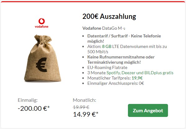 Vodafone DataGo M (8GB LTE) für effektiv 9,16€/Monat.