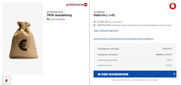 Vodafone DataGo L (16GB LTE) für effektiv 13,74€/Monat – dank 390€ Auszahlung!