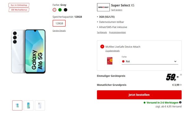 Low-Budget-Tarif inkl. Smartphone gesucht, perfekt bei MediaMarkt bekommt ihr das Samsung Galaxy A16 5G + 3GB 5G + Alles-Flat im o2-Netz für 3,99€/Monat