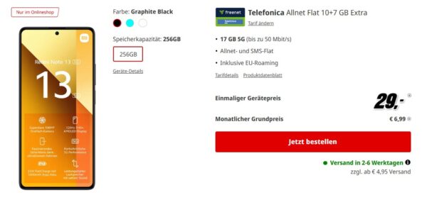Low-Budget-Tarif inkl. Smartphone gesucht, dann könnte der aktuelle Deal von MediaMarkt genau der richtige sein, dort bekommt ihr das Xiaomi Redmi Note 13 5G + 17GB 5G + Alles-Flat im o2-Netz für 6,99€/Monat