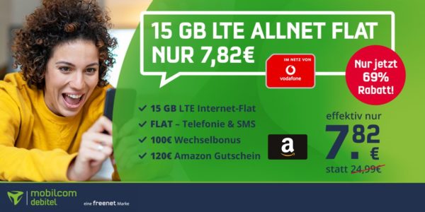 Denn bei mobilcom-debitel bekommt man den md 15 GB LTE Allnet Flat-Tarif (Allnet, SMS, 15 GB LTE) für 16,99€/Monat – eff. 7,82€/Monat.