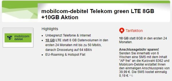 Sendet innerhalb von 6 Wochen eine SMS mit dem Inhalt „AP frei“ an die Kurzwahl 8362 und Mobilcom-Debitel erstattet den einmaligen Anschlusspreis von 39,99 €. Die SMS kostet einmalig 0,19 €.