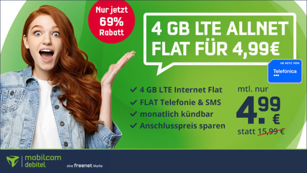 Was für ein krasses Angebot bei mobilcom-debitel dort bekommt ihr die monatlich kündbare 4 GB LTE + Alles-Flat (VoLTE & WLAN Call) im Telefonica-Netz für für 4,99€/Monat.
