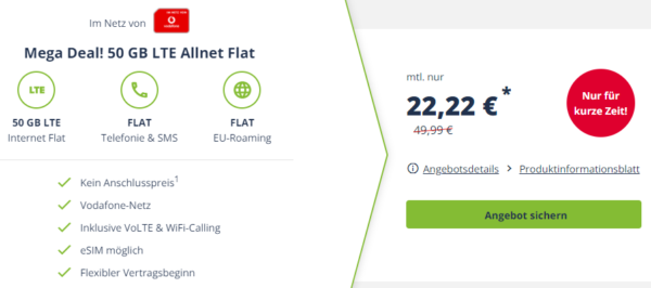 *ENDET* *KNALLER* *KEINE AG* 50 GB LTE (bis 100 Mbit/s) + Alles-Flat & WiFi Call + eSIM im Vodafone-Netz für 22,22€