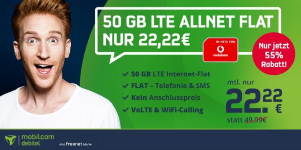 Denn bei mobilcom-debitel bekommt man den md green LTE 50 GB Aktion-Tarif (Allnet, SMS, 50 GB LTE) für 22,22€/Monat.