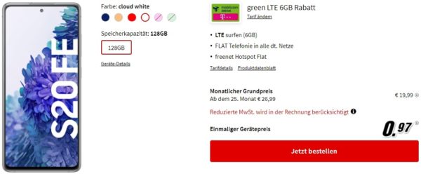 *TARIF EFFEKTIV GRATIS* md green LTE 6GB Rabatt-Tarif (Allnet-Flat, 6 GB LTE, Telekom) inkl. Samsung Galaxy S20 FE für 19,99€/Monat