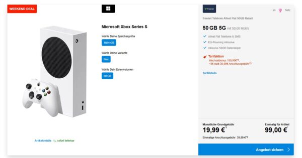 Nice bei handytick bekommt ihr als Weekend-Deal die Microsoft Xbox Series S + 50GB 5G + Alles-Flat im Telekom-Netz für 19,99€/Monat