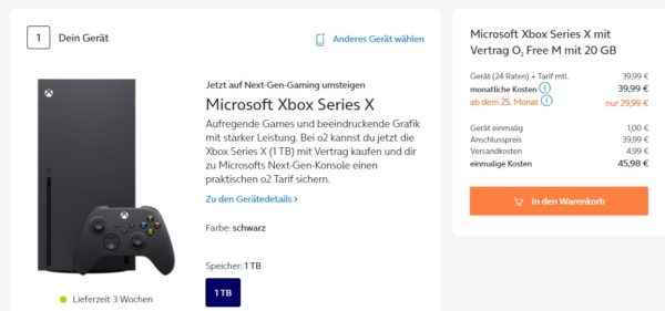 Und jetzt mal ein Tarif mit der Xbox Series X, bei o2 bekommt ihr die Microsoft Xbox Series X + 20 GB LTE + Alles-Flat im o2-Netz für 39,99€/Monat