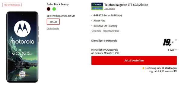 Schönes Angebot seitens MediaMarkt, dort bekommt ihr das Motorola Edge 40 Neo + 6GB LTE + Alles-Flat im o2-Netz für 9,99€/Monat