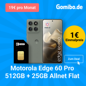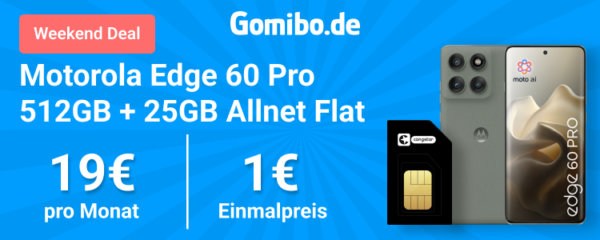 Neuer Weekend-Deal seitens Gomibo, dort bekommt ihr das Motorola Edge 60 Pro (512GB) + 25GB 5G + Alles-Flat im Telekom-Netz für 19€/Monat