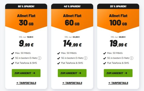 Die Tarife gibt es auch als monatlich kündbare Variante, 30GB für 14,99€/Monat, 60GB für 19,99€, 100GB für 24,99€