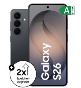 - So sicherst Du Dir doppelten Speicher bei Deiner Vorbestellung! Für private Endkunden ab 18 Jahren und gewerbliche Endkunden. Bei verbindlicher Vorbestellung eines Galaxy S26 | S26+ mit 256 GB bzw. 512 GB oder Galaxy S26 Ultra mit 256 GB | 512 GB mit entsprechender EAN („Aktionsgerät“) zwischen dem 25.2.2026 und dem 10.3.2026 („Erwerbszeitraum“) bei einem in Deutschland ansässigen teilnehmenden Händler/Netzbetreiber erhalten Kunden im Bestellprozess die Möglichkeit, das von ihnen gewählte Aktionsgerät mit der jeweils nächstgrößeren Speichervariante ohne Aufpreis verbindlich vorzubestellen („Upgrade“). Der Kunde ist selbst dafür verantwortlich, ein Aktionsgerät mit der von ihm gewünschten Speichervariante auszuwählen. Hat sich der Kunde bereits für die höchste Speichervariante von 512 GB entschieden, so erhält er das von ihm gewählte Aktionsgerät zum Preis des Aktionsgerätes mit der nächstkleineren Speichervariante. Bei endgültiger Kaufrückabwicklung wird der tatsächlich bezahlte Kaufpreis zurückerstattet. Solange der Vorrat reicht. Ausrichter der Aktion ist Samsung Electronics GmbH, Frankfurter Straße 2, 65760 Eschborn, Deutschland