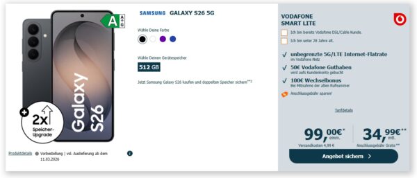 *NEUHEIT EFF. 205€ ERSPARNIS* Samsung Galaxy S26 512GB + Unbegrenzte 5G + Alles-Flat im Vodafone-Netz für 34,99€/Monat