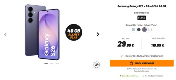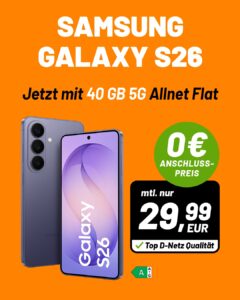 Bei klarmobil bekommt ihr das Samsung Galaxy S26 512GB + 40GB 5G + Alles-Flat im Vodafone-Netz für 29,99€/Monat