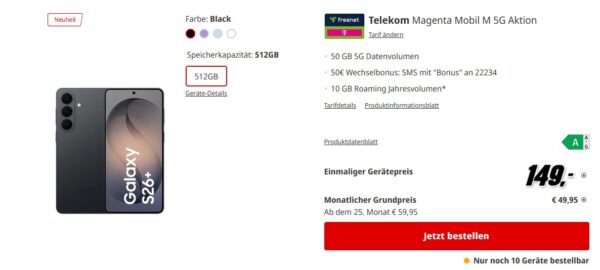 Fazit: Schöner Deal mit dem brandneuen Samsung Galaxy S26+ im Telekom-Netz, hierbei handelt es sich um ein streng limitiertes Kontingent, bei Interesse also am besten zeitnah zuschlagen.