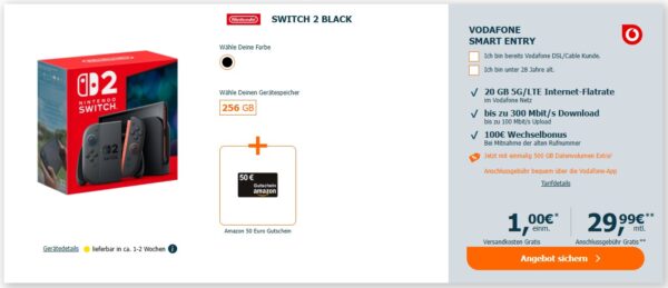 Nintendo Switch 2 + 50€ Amazon Gutschein* + 20GB 5G + Alles-Flat im Vodafone-Netz für 29,99€/Monat – eff. 5,03€/Monat