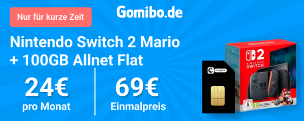 Schöner Deal seitens Gomibo, dort bekommt ihr die Nintendo Switch 2 Konsole Mario Kart + 100GB 5G + Alles-Flat im Telekom-Netz für 24€/Monat