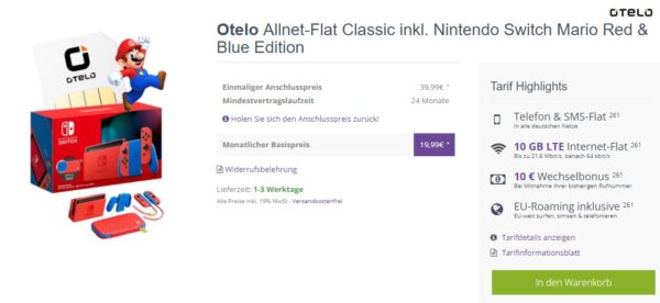 Nintendo Switch limitierte Mario Edition + 10 GB LTE + Alles-Flat im Vodafone-Netz für 19,99€/Monat – Effektiv 6,28€/Monat