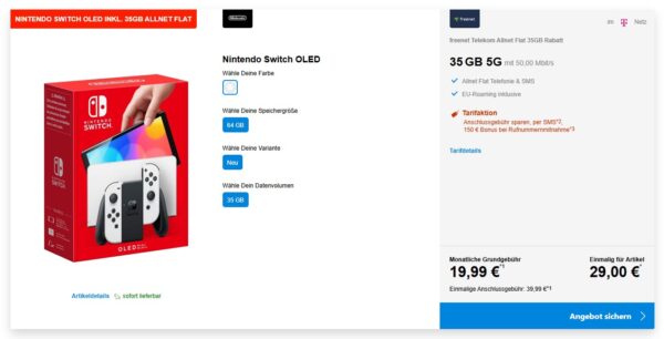 Nintendo Switch OLED + 35GB 5G + Alles-Flat im Telekom-Netz für 19,99€/Monat – eff. 2,45€/Monat