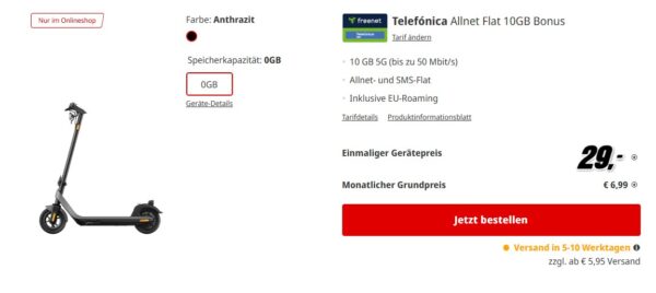 - Alternativ mit 20GB 5G im o2-Netz für 79€ Zuzahlung und 9,99€/Monat