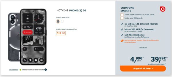 Nothing Phone (2) + 65GB LTE + Alles-Flat im Vodafone-Netz für 39,99€/Monat