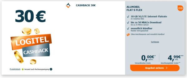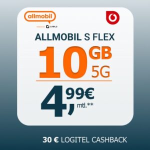 Neuer Deal seitens LogiTel, allerdings nur für kurze Zeit! Dort könnt ihr euch jetzt die Allmobil 10GB 5G + Alles-Flat im Vodafone-Netz für 4,99€/Monat (mtl. kündbar) + 30€ Cashback sichern.