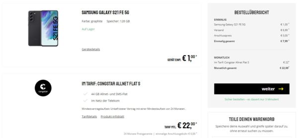 *NUR BIS 16 UHR* Samsung Galaxy S21 FE 5G + 44GB LTE + Alles-Flat im Telekom-Netz für 22€/Monat – eff. 4,04€/Monat
