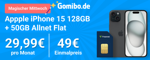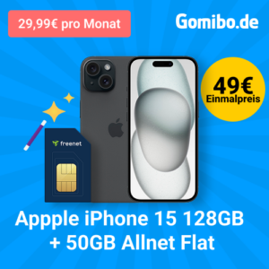 Schöner Deal, bei Gomibo bekommt ihr nur heute das Apple iPhone 15 128GB + 50GB 5G + Alles-Flat im Telekom-Netz für 29,99€/Monat + 150€ Bonus + 0€ AG