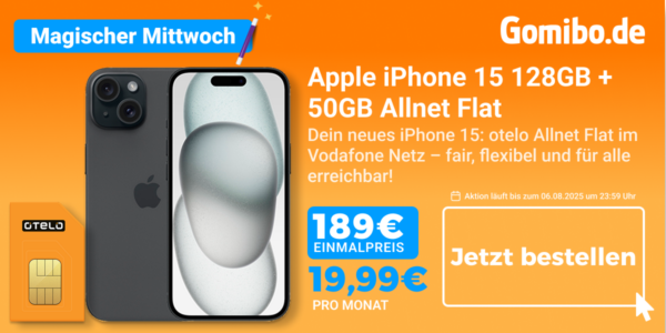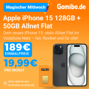 Bei Gomibo bekommt ihr nur heute das Apple iPhone 15 + 50GB 5G + Alles-Flat im Vodafone-Netz für 19,99€/Monat