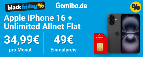 Als Weekend-Deal bekommt ihr bei Gomibo das Apple iPhone 16 (256GB) + unlimited 5G + Alles-Flat im Vodafone-Netz für 34,99€/Monat