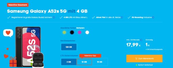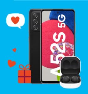 Bei Blau bekommt ihr das Samsung Galaxy A52s + 4 GB LTE + Alles-Flat im o2-Netz für 17,99€/Monat + gratis Kopfhörer