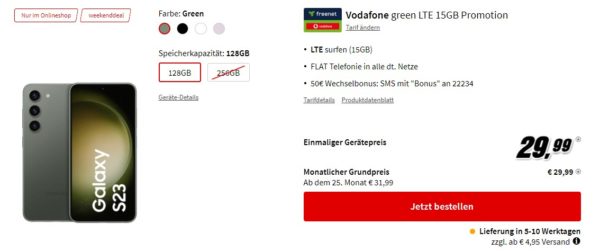 Stark, bei MediaMarkt bekommt ihr als Weekend-Deal das Samsung Galaxy S23 + 15GB LTE + Telefon-Flat im Vodafone-Netz für 29,99€/Monat