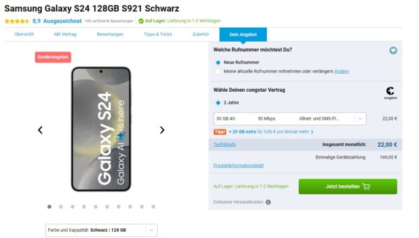 Nice, bei Gomibo bekommt ihr nur heute das Samsung Galaxy S24 + 30GB LTE + Alles-Flat im Telekom-Netz für 22€/Monat