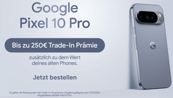 Zwischen dem 20.08.2025 und 11.09.2025 erhalten Käufer eines neuen Pixel 10, Pixel 10 Pro oder Pixel 10 Pro XL (alle Farben und Speichergrößen) beim Kauf direkt bei Amazon („Verkauf und Versand durch Amazon“) einen zusätzlichen Trade-in-Bonus von bis zu 250 €. Dieser Bonus wird on top zum Rückkaufwert deines Altgeräts gezahlt.