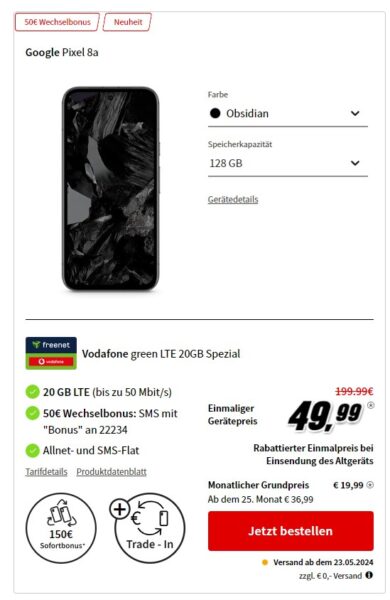 Schönes Angebot von MediaMarkt mit dem neuen Google Pixel 8a, dort bekommt ihr das Google Pixel 8a + 20GB LTE + Alles-Flat im Vodafone-Netz für 19,99€/Monat
