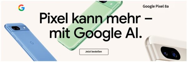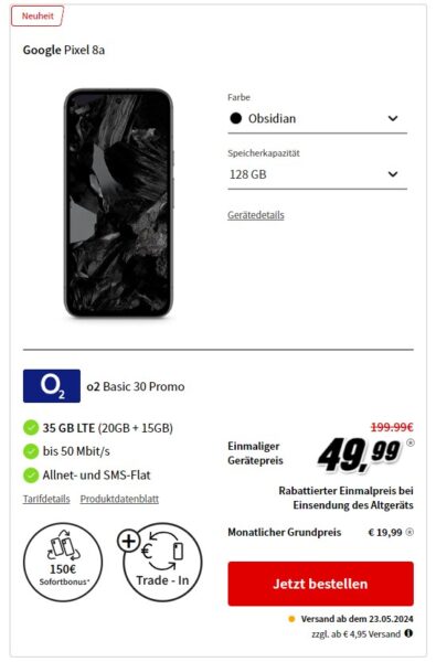 Schönes Angebot von MediaMarkt mit dem neuen Google Pixel 8a, dort bekommt ihr das Google Pixel 8a + 35GB LTE + Alles-Flat im o2-Netz für 19,99€/Monat