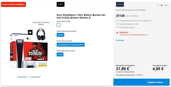 Playstation 5 Disc inkl. COD Modern Warfare III inkl. 3D Wireless Headset + 25GB LTE + Alles-Flat im Telekom-Netz für 31,99€/Monat