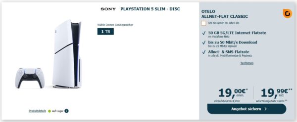PlayStation 5 (Slim + Disc + 1TB) + 50GB 5G + Alles-Flat im Vodafone-Netz für 19,99€/Monat – eff. 0,99€/Monat
