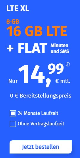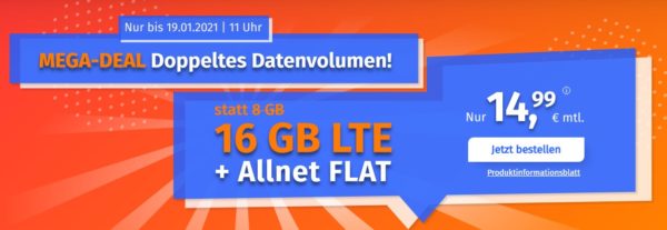 Bei PremiumSIM, einer Marke der Drillisch AG (WinSIM, Simply & Co.), erhaltet ihr nur bis einschließlich 19. Januar- 11 Uhr die 16 GB LTE Allnet-Flat für 14,99€/Monat im Netz von O2 Telefonica.