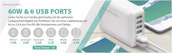 RAVPower 6 Port USB Ladegerät (60W) für 14,99€