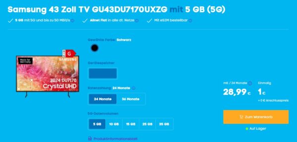 Samsung 43″ 4K TV + 5 GB 5G + Alles-Flat im o2-Netz für 28,99€/Monat