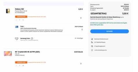 - Gewünschte Zugabe über den Samsung Shop suchen und ebenfalls in den Warenkorb legen (teilnehmende Produkte aus dieser Liste oder aus dem Konfigurator suchen)!