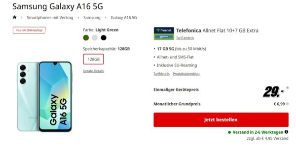 Low-Budget-Tarif mit ordentlich GB gesucht, bei MediaMarkt bekommt ihr das Samsung Galaxy A16 5G + 17GB 5G + Alles-Flat im o2-Netz für 6,99€/Monat