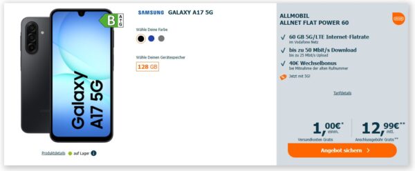 Samsung Galaxy A17 5G 128GB + 60GB 5G + Alles-Flat im Vodafone-Netz für 12,99€/Monat – eff. 4,91€/Monat